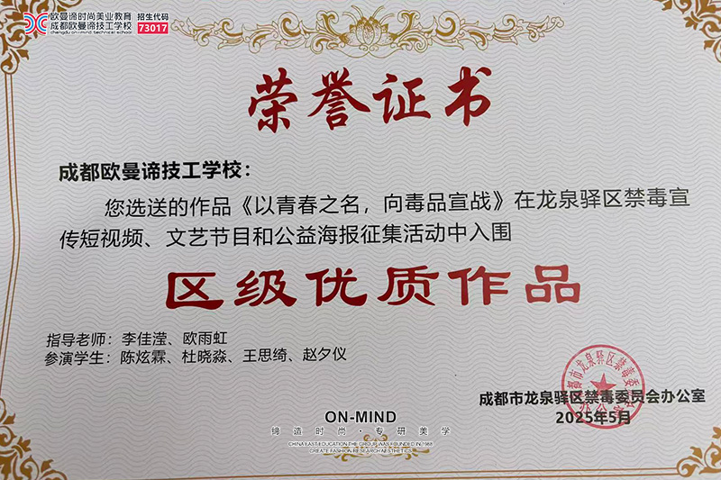 为积极响应成都市龙泉驿区禁毒委员会办公室开展禁毒主题绘画作品征集活动的号召,学校发起校园禁毒绘画作品征集活动,其中学生绘画作品《以青春之名,向毒品宣战》在龙泉驿区禁毒宣传短视频、文艺节目和公益海报征集活动中入围“区级优质作品”奖。