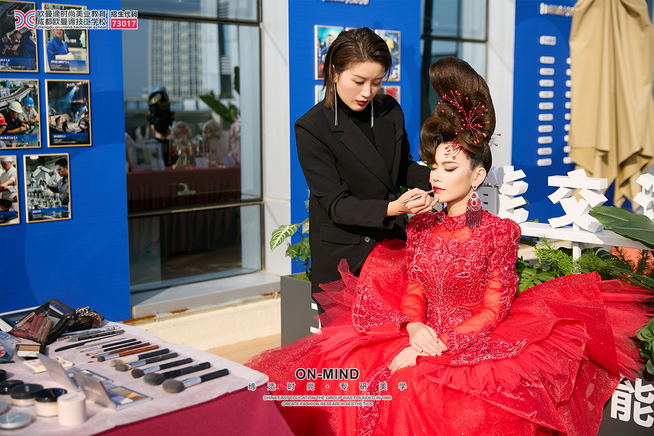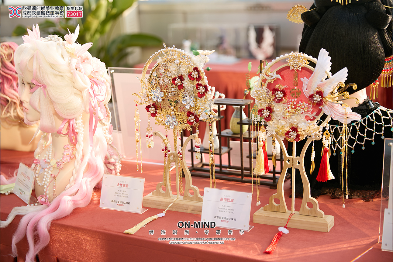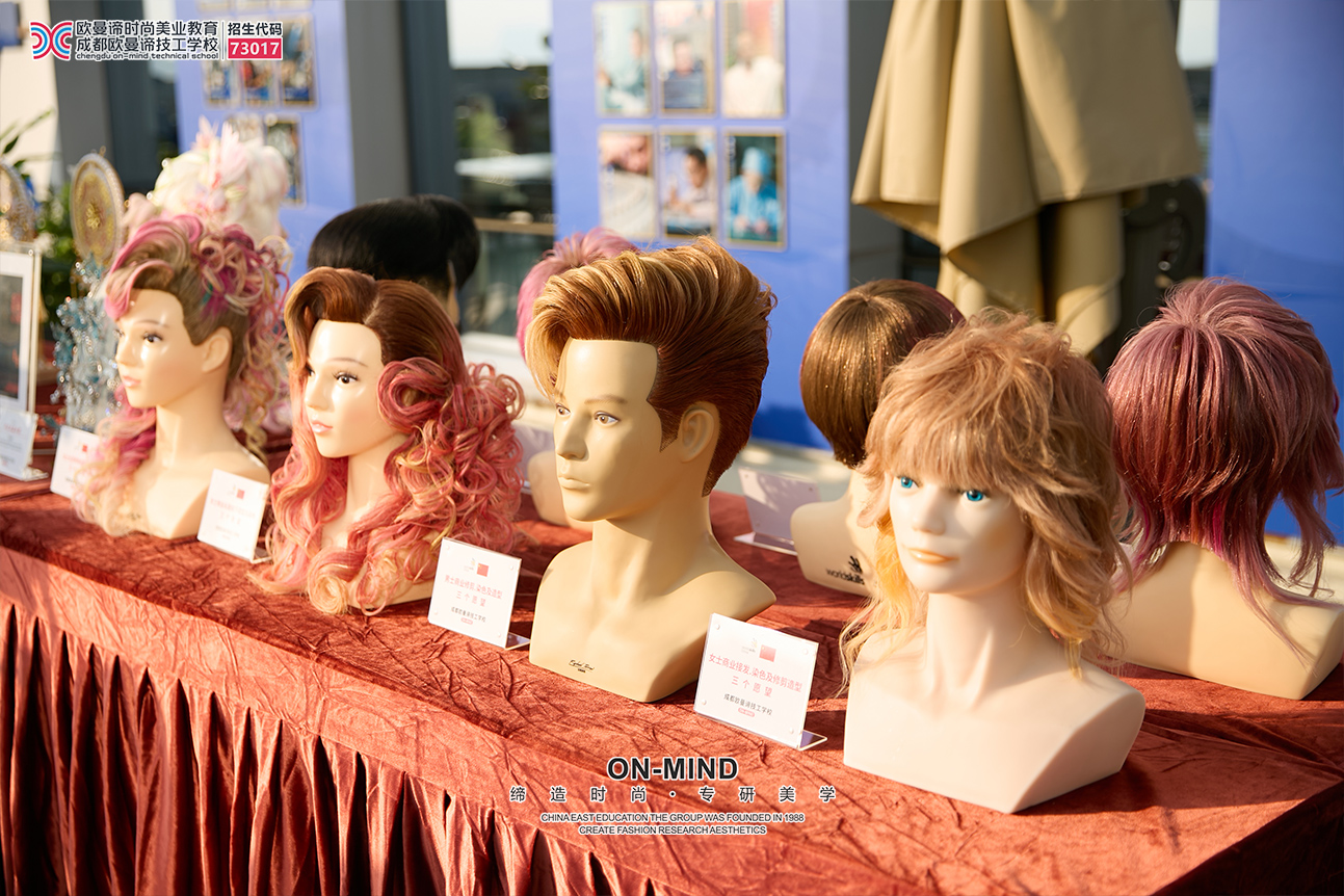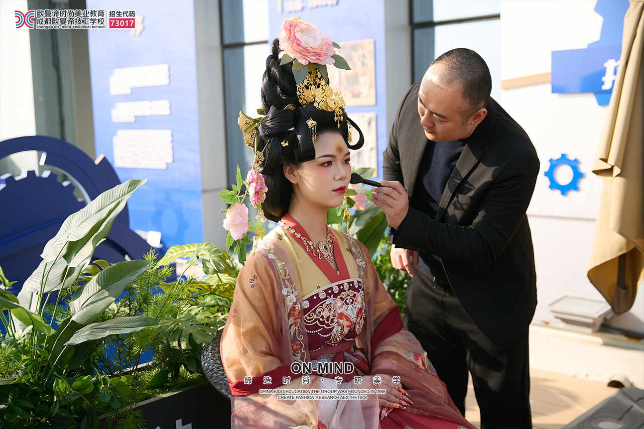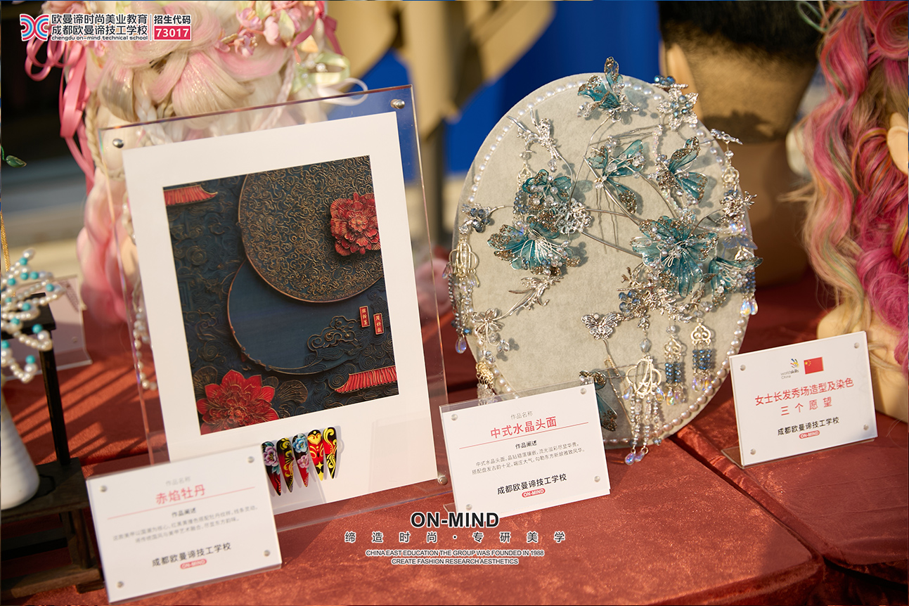 活动现场汇聚了刺绣工艺、智能制造、航空科技、服装设计等作品展台,集中展示四川省各领域职业技能人才培育成果。学校展区凭借特色鲜明的美业教学成果精彩亮相,吸引了各级领导及参会者驻足关注。师生通过动态演示与静态陈列相结合的方式,系统呈现了创意T台妆造、唐代妆发设计、女士长发秀场造型及染色、男士商业修剪染色及造型、时尚美甲、传统非遗工艺手工饰品等教学成果,每项作品均植根于课程教学与实训实践,体现了技术规范与艺术表达的有机统一。
