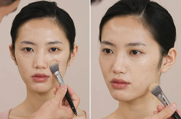 以压和擦结合的上妆手法来上粉底。想要遮盖力强要用轻拍按压的方式,压上去的颜色会看起来比较实。想要妆效服帖、薄透的就用海绵轻轻擦过,大面积铺匀粉底。