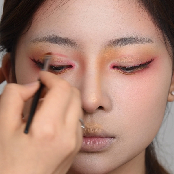 Step6:顺着下眼睑勾勒一下,填补卧蚕,并用大红色眼影过渡,将下眼线晕染开。