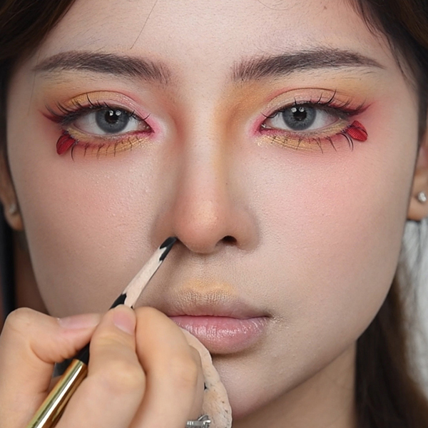 Step11:修饰下鼻子,显得更小巧。用粉色眼影带到鼻头,上唇,唇下。